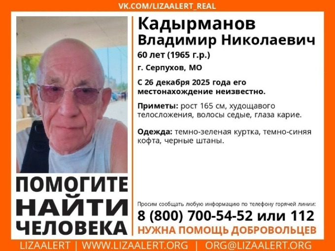 Участники поискового движения «Лиза Алерт» накануне присоединились к поискам Владимира Николаевича Кадырманова, пропавшего в Серпухове. К сожалению, времени с момента исчезновения мужчины прошло уже много. Он ушёл из дома и перестал выходить на связь ещё 26 декабря 2025 года.