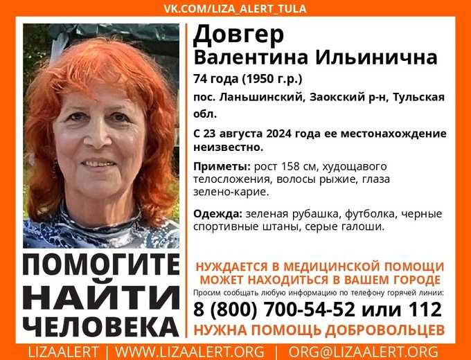 Вот уже вторые сутки близкие и волонтёры ищут 74-летнюю Валентину Довгер. Она может быть как на севере Тульской области, так и в соседнем подмосковном Серпухове. Женщина ушла из дома в посёлке Ланьшинском Заокского района Тульской области ещё 23 августа.