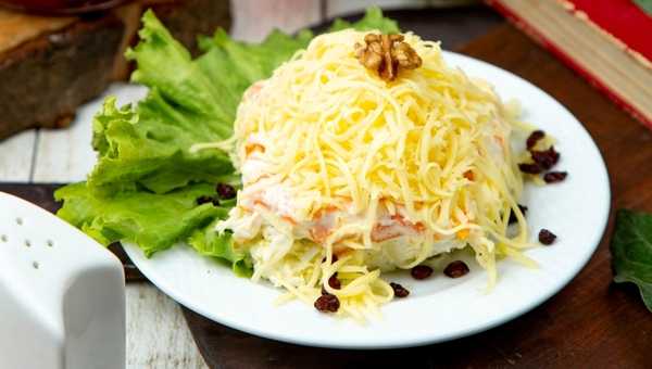 Потребуется пачка крабовых палочек, 3 сваренных вкрутую яйца, 1 небольшая луковица, 2 свежих огурца, 100 грамм твёрдого сыра, майонез, соль и перец по вкусу. Грибы надо помыть, нарезать и вместе с луком обжарить до золотистости в небольшом количестве подсолнечного масла. Огурец и палочки режут тонкой соломкой, яйца кубиком.