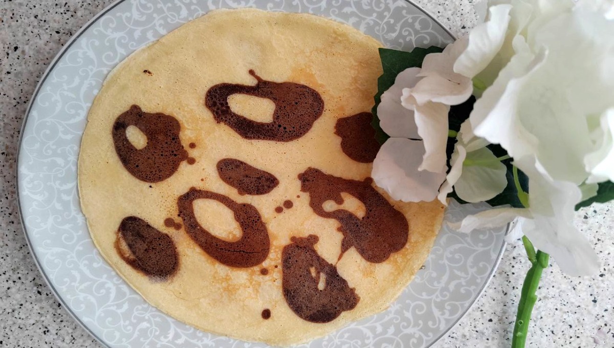 Весь секрет — в шоколадных пятнышках, как на шкуре хищника. Тесто для блинов нужно сделать по обычному рецепту. Например, два яйца, две столовых ложки сахара, несколько щепоток соли перемешать, добавить стакан тёплого молока, 120 грамм просеянной пшеничной муки, ещё раз перемешать, добавить ещё один стакан тёплого молока и 2 столовые ложки растительного масла, вымешать жидкое тесто, оставить на 10 минут настояться.