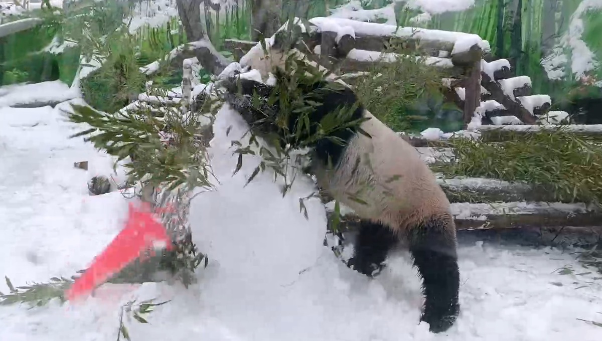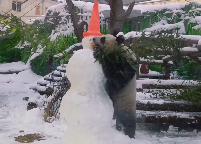 Для каждой панды сотрудники соорудили большого снеговика, украсив его веточками бамбука или морковью. Самец Жуи, обычно флегматичный, неожиданно набросился на снежного гостя и за несколько минут раскрошил огромного снеговика на мелкие снежинки, после чего с достоинством удалился.