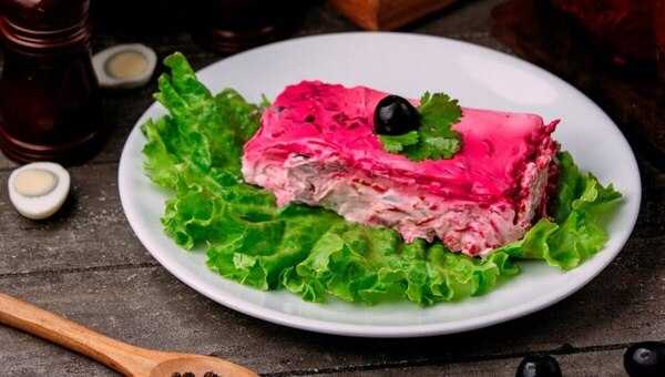 Затем укладывается слой варёной моркови и свёклы. Гости наверняка будут заинтригованы свежим звучанием знакомого с детства блюда.