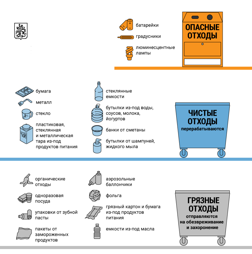 На контейнерных площадках появятся баки двух цветов. Синие баки (с изображением бутылки) будут предназначены для «чистого» мусора, который возможно переработать: пластик, металл, макулатура, стекло, бумага. А серые баки (с изображением банана) будут предназначены для смешанных отходов - пищевых, растительных, загрязненных, средств личной гигиены - «грязного» мусора.