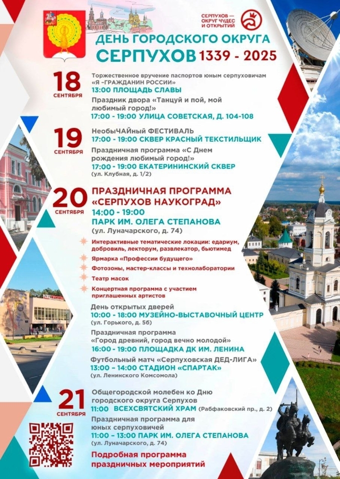 В Серпухове основные праздничные мероприятия по случаю 686 годовщины города пройдут в субботу 20 сентября. Местом массовых гуляний и выступления артистов станет парк имени Олега Степанова. Площадь Ленина в этом году не будет задействована в качестве праздничной локации, что весьма непривычно для горожан.