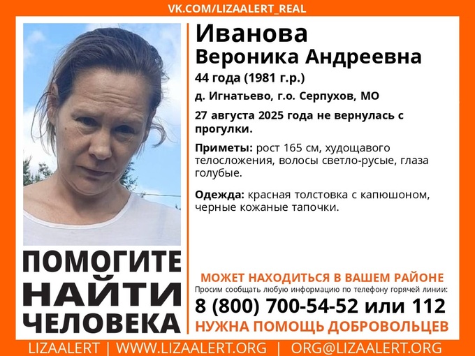 В Серпухове ведутся поиски 44-летней жительницы деревни Игнатьево Вероники Ивановой. Как сообщает штаб поискового отряда «Лиза Алерт», женщина ушла прогуляться в окрестностях села в среду 27 августа, с тех пор её никто не видел.